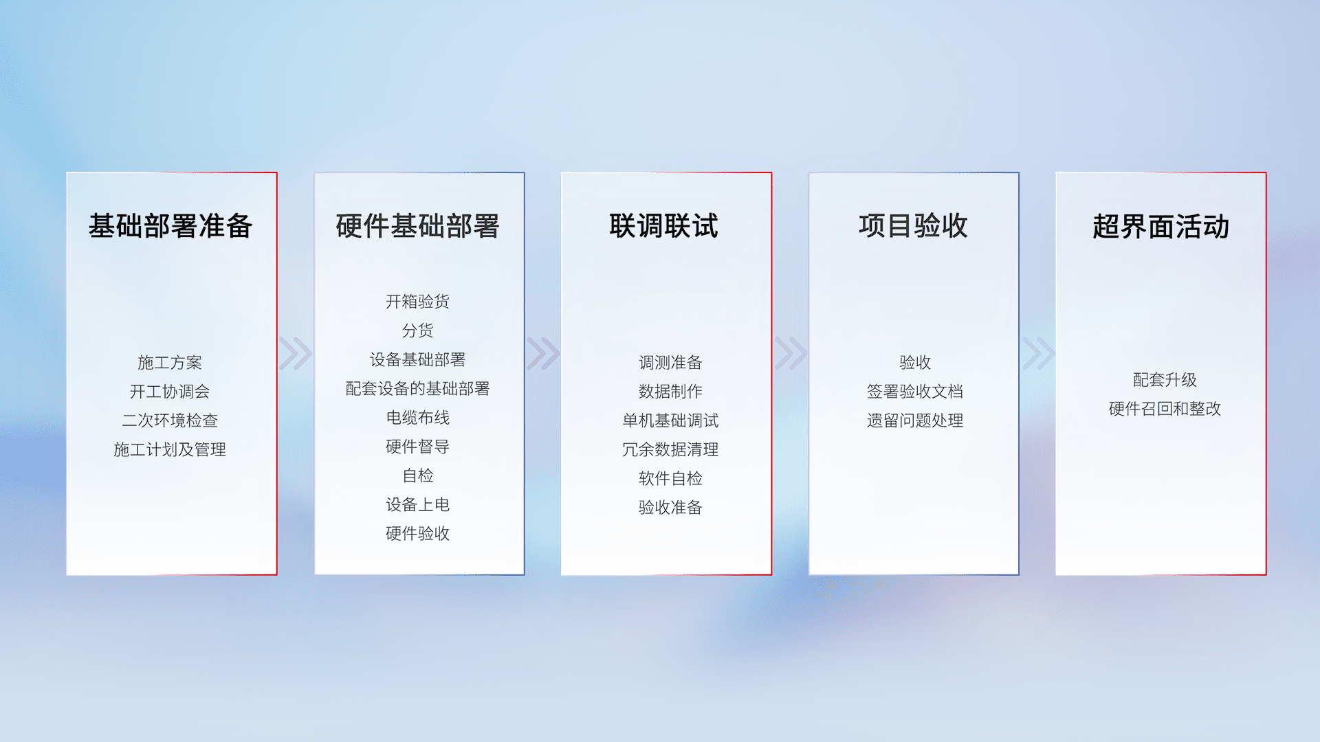 从基础部署准备、、、硬件基础部署、、、联调联试、、、、项目验收、、、、越界面活动的全过程可追溯,,,,保证施工质量和进度。。
