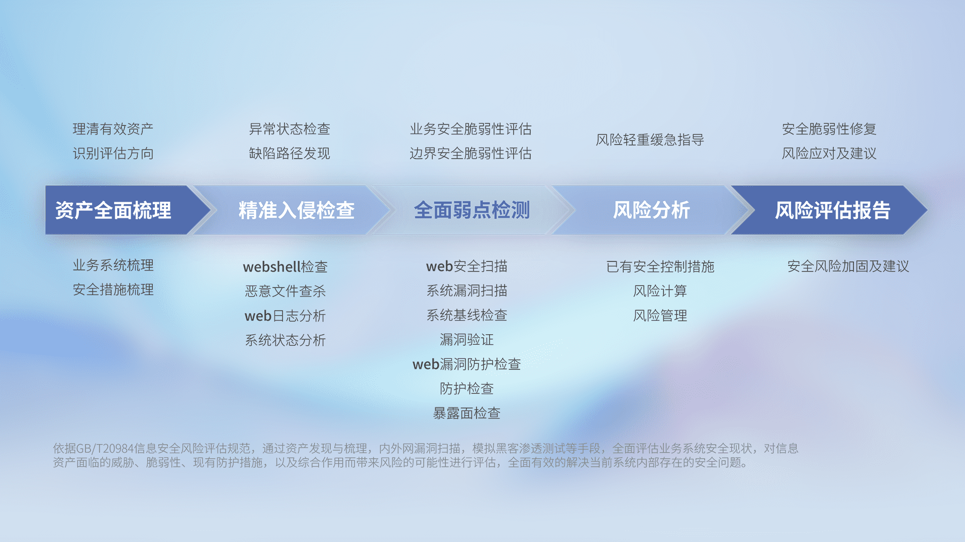 针对客户行业特性,,,以专业的安全服务+多厂商联合解决方案提供专属的一站式安全管理服务,,,,帮助客户全面感知网络空间威胁,,基于识别、、检测、、、分析、、、、防护、、、监测、、、、响应的服务理论模型,,,,从方案咨询、、、、集成交付、、、评估验证、、、优化加固、、运维运营,,,致力于为客户提供完整的闭环管理式安全服务。。。。以实战经验为客户打造高抵御风险的安全体系,,,,帮助客户发现威胁、、对抗威胁、、处置威胁,,,不断积累安全对抗能力,,,,持续保障数字化安全。。。。